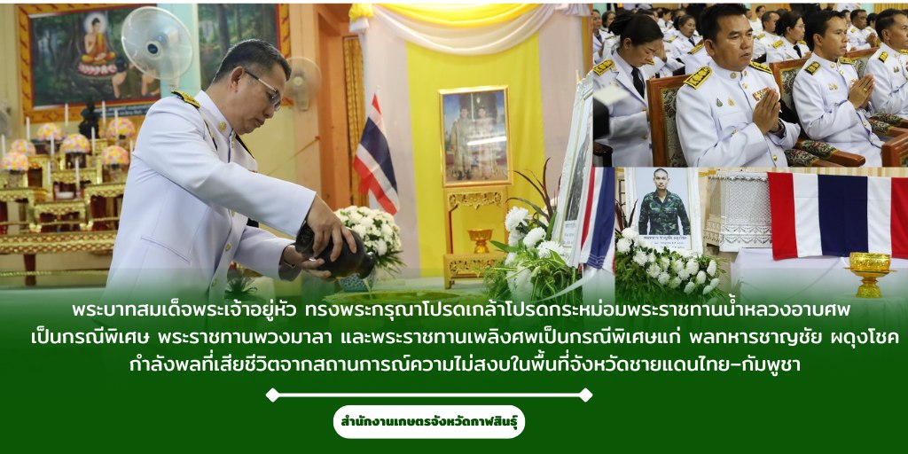 [เกษตรจังหวัดกาฬสินธุ์ร่วมพิธีพระราชทานน้ำหลวงอาบศพ เป็นกรณีพิเศษ พระราชทานพวงมาลา และพระราชทานเพลิงศพเป็นกรณีพิเศษแก่ พลทหารชาญชัย ผดุงโชค กำลังพลที่เสียชีวิตจากสถานการณ์ความไม่สงบในพื้นที่จังหวัดชายแดนไทย–กัมพูชา] 13 ธันวาคม 2025