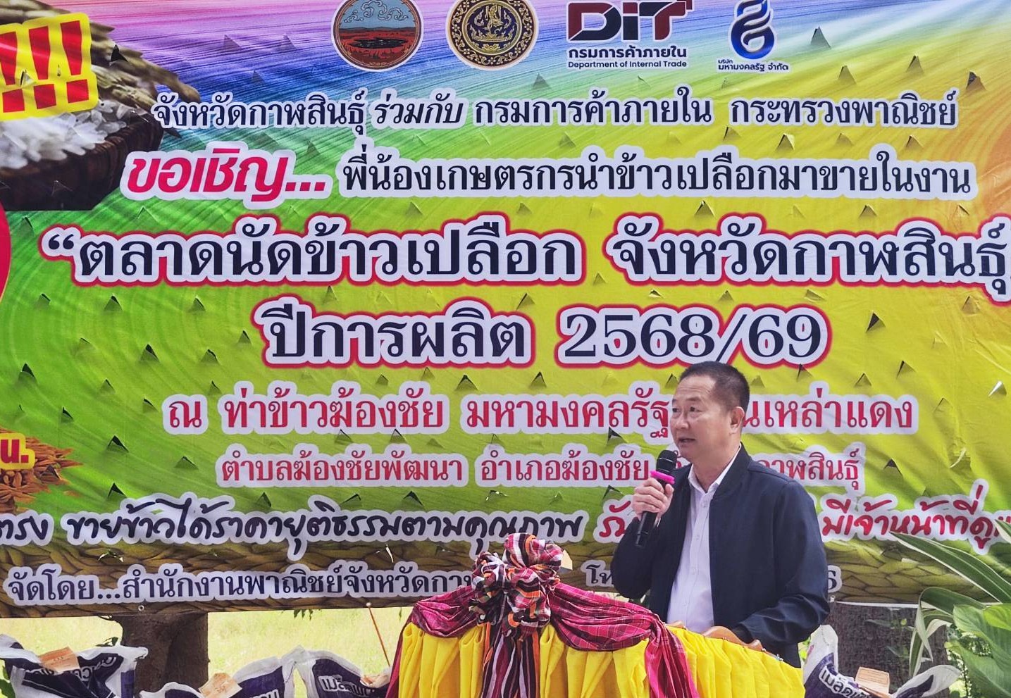 ปีการผลิต 2568/69 สำนักงานพาณิชย์จังหวัดกาฬสินธุ์ กำหนดจัดตลาดนัดข้าวเปลือกปีการผลิต 2568/69เพื่อเป็นทางเลือกในการขายข้าวเปลือกของเกษตรกร ซึ่งตลอดการซื้อขายเกษตรกรจะได้รับการดูแลจากเจ้าหน้าที่เพื่อให้ได้รับความเป็นธรรมในการชั่งน้ำหนัก การตรวจสอบคุณภาพข้าวโดยกำหนดจัดตลาดนัดฯ ระหว่างวันที่ 18-21 พฤศจิกายน 2568 ณ ท่าข้าวฆ้องชัย มหานครรัฐ บ้านเหล่าแดง ตำบลฆ้องชัยพัฒนา อำเภอฆ้องชัยจังหวัดกาฬสินธุ์ โดยมีท่านรองผู้ว่าราชการจังหวัดกาฬสินธุ์ (นายผดุงศักดิ์ อิ่มเอิบ) เป็นประธานในพิธีเปิดครั้งนี้