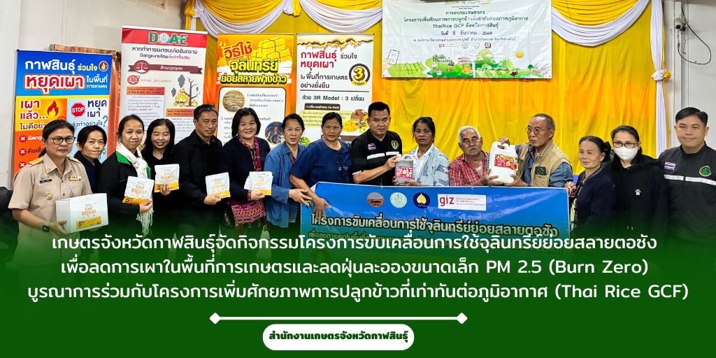 วันที่ 8 ธันวาคม 2568 นายคมกริช ไตรยศ เกษตรจังหวัดกาฬสินธุ์ พร้อมด้วยนางสาวอริสรา ภูเด่นผา หัวหน้ากลุ่มส่งเสริมและพัฒนาการผลิต และเจ้าหน้าที่สำนักงานเกษตรจังหวัดกาฬสินธุ์ ร่วมกับ สำนักงานเกษตรอำเภอยางตลาด หน่วยงานสังกัดกระทรวงเกษตรและสหกรณ์ หน่วยงานรัฐวิสาหกิจ องค์กรความร่วมมือระหว่างประเทศของเยอรมัน (GIZ) องค์กรเครือข่ายต่าง ๆ รวมถึงวิสาหกิจชุมชนศูนย์รวมสุขภาพธรรมชาติบำบัดสภาวะแวดล้อมเกษตรอินทรีย์ธรรมโชติ จัดอบรมโครงการขับเคลื่อนการใช้จุลินทรีย์ย่อยสลายตอซัง เพื่อลดการเผาในพื้นที่การเกษตร และลดฝุ่น PM2.5 (Burn Zero) บูรณาการร่วมกับ โครงการเพิ่มศักยภาพการปลูกข้าวที่เท่าทันต่อภูมิอากาศ (Thai Rice GCF) ณ องค์การบริหารส่วนตำบลดอนสมบูรณ์ อำเภอยางตลาด จังหวัดกาฬสินธุ์