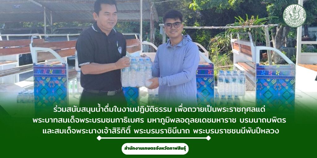 วันที่ 2 ธันวาคม 2568 นายคมกริช ไตรยศ เกษตรจังหวัดกาฬสินธุ์ สนับสนุนน้ำดื่ม งานปฏิบัติธรรมจังหวัดกาฬสินธุ์ ประจำปี 2568 เพื่อถวายเป็นพระราชกุศลแด่ พระบาทสมเด็จพระบรมชนกาธิเบศร มหาภูมิพลอดุลยเดชมหาราช บรมนาถบพิตร และสมเด็จพระนางเจ้าสิริกิติ์ พระบรมราชินีนาถ พระบรมราชชนนีพันปีหลวง โดยกิจกรรมปฏิบัติธรรมจะจัดระหว่างวันที่ 3 – 4 ธันวาคม 2568 ณ พุทธมนฑลจังหวัดกาฬสินธุ์ (แก่งดอนกลาง)