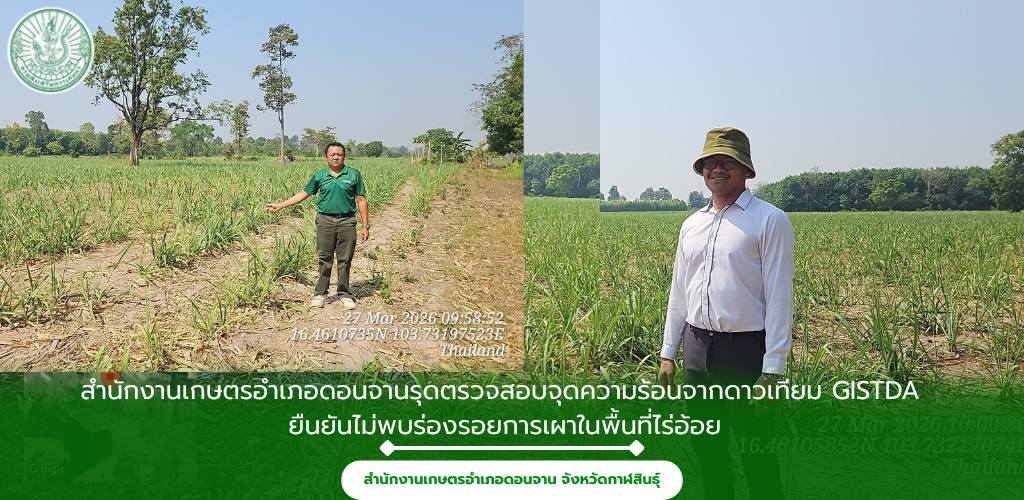 เมื่อวันที่ 27 มีนาคม 2569 สำนักงานเกษตรอำเภอดอนจาน จังหวัดกาฬสินธุ์ ลงพื้นที่ตรวจสอบข้อเท็จจริงอย่างเร่งด่วน หลังได้รับรายงานข้อมูลจุดความร้อน (Hotspot) จากสำนักงานพัฒนาเทคโนโลยีอวกาศและภูมิสารสนเทศ (องค์การมหาชน) หรือ GISTDA