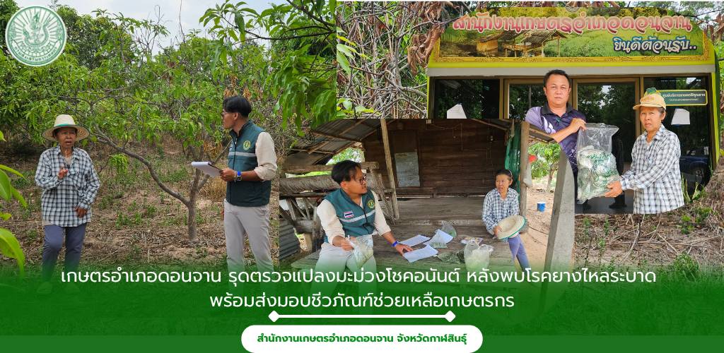 เมื่อวันที่ 24 มีนาคม 2569 นางจุรีรัตน์ หนองสุธรรม รักษาราชการแทนเกษตรอำเภอดอนจาน มอบหมายให้เจ้าหน้าที่สำนักงานเกษตรอำเภอดอนจาน ลงพื้นที่ตรวจสอบแปลงปลูกมะม่วงโชคอนันต์ของเกษตรกร ณ หมู่ 8 ตำบลนาจำปา จังหวัดกาฬสินธุ์ หลังได้รับรายงานสถานการณ์ต้นมะม่วงยืนต้นแห้งตาย