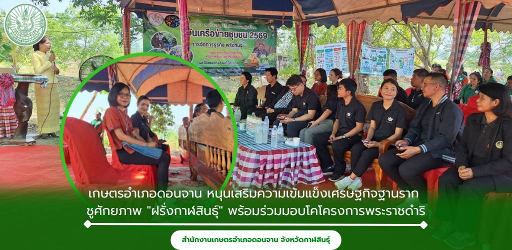 กาฬสินธุ์, 2 เมษายน 2569 — สำนักงานเกษตรอำเภอดอนจาน เดินหน้าสนับสนุนเครือข่ายวิสาหกิจชุมชนอย่างต่อเนื่อง ล่าสุดร่วมลงพื้นที่จัดกิจกรรม “วันเครือข่ายชุมชน 2569” เพื่อยกระดับและจุดประกายการจัดการธุรกิจ “ฝรั่งกาฬสินธุ์” ผลไม้เศรษฐกิจสำคัญของพื้นที่ ควบคู่ไปกับการสานต่อโครงการอันเนื่องมาจากพระราชดำริ