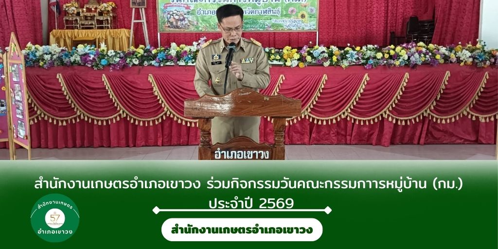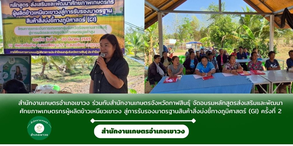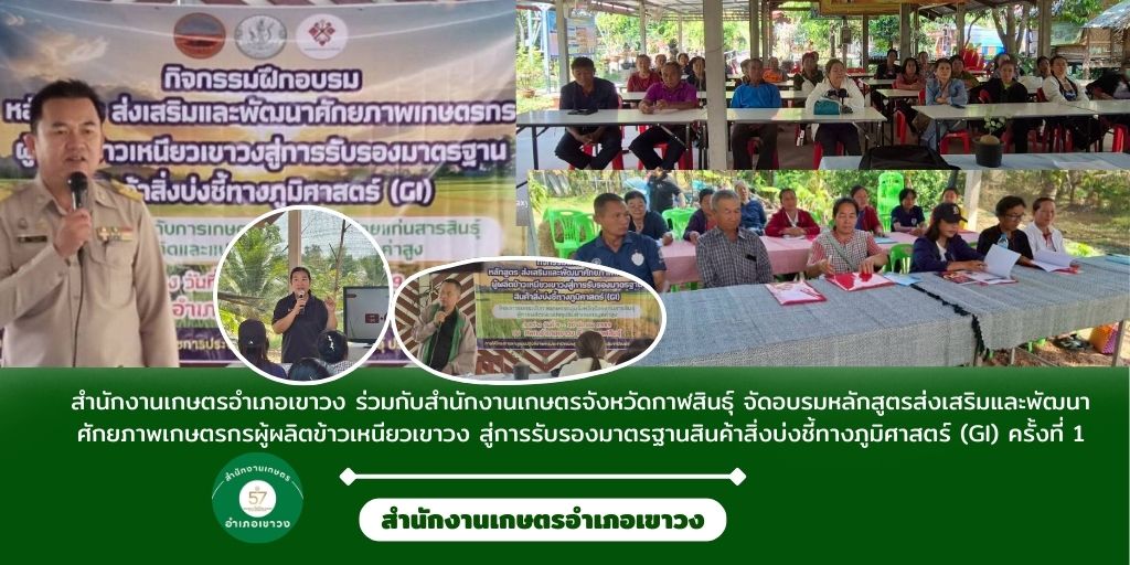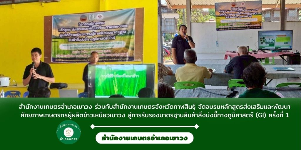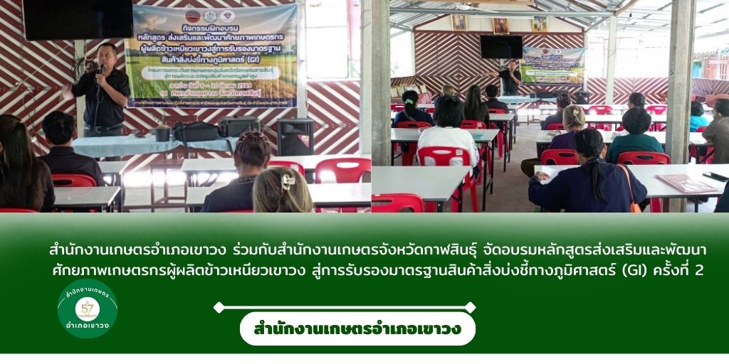 สำนักงานเกษตรอำเภอเขาวง ร่วมกับสำนักงานเกษตรจังหวัดกาฬสินธุ์ จัดอบรมหลักสูตรส่งเสริมและพัฒนาศักยภาพเกษตรกรผู้ผลิตข้าวเหนียวเขาวง สู่การรับรองมาตรฐานสินค้าสิ่งบ่งชี้ทางภูมิศาสตร์ (GI) ครั้งที่ 1