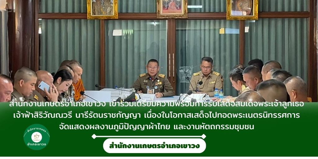 สำนักงานเกษตรอำเภอเขาวง เข้าร่วมเตรียมความพร้อมการรับเสด็จสมเด็จพระเจ้าลูกเธอ เจ้าฟ้าสิริวัณณวรี นารีรัตนราชกัญญา เนื่องในโอกาสเสด็จไปทอดพระเนตรนิทรรศการจัดแสดงผลงานภูมิปัญญาผ้าไทย และงานหัตถกรรมชุมชน