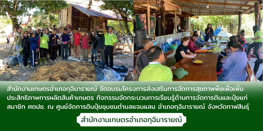 วันที่ 17 ธันวาคม 2568 นายก่อเกียรติ ใจอ่อน นักวิชาการส่งเสริมการเกษตรชำนาญการ รักษาราชการแทนเกษตรอำเภอกุฉินารายณ์ มอบหมายให้นางสาวสุทธิพร โยหาสิทธิ์ นักวิชาการส่งเสริมการเกษตรปฏิบัติการ เจ้าหน้าที่สำนักงานเกษตรอำเภอกุฉินารายณ์ พร้อมด้วยนักศึกษาฝึกประสบการณ์ มหาวิทยาลัยกาฬสินธุ์ ลงพื้นที่จัดอบรมโครงการส่งเสริมการจัดการสุขภาพพืชเพื่อเพิ่มประสิทธิภาพการผลิตสินค้าเกษตร กิจกรรมจัดกระบวนการเรียนรู้ด้านการจัดการดินและปุ๋ยแก่สมาชิก ศดปช. ณ ศูนย์จัดการดินปุ๋ยชุมชนตำบลแจนแลน ตำบลแจนแลน อำเภอกุฉินารายณ์ จังหวัดกาฬสินธุ์