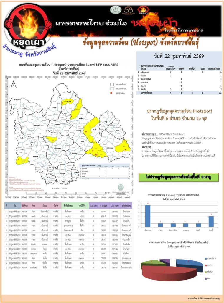 ข้อมูลจุดความร้อนจากดาวเทียม Suomi NPP ระบบ VIIRS จังหวัดกาฬสินธุ์ 20260222