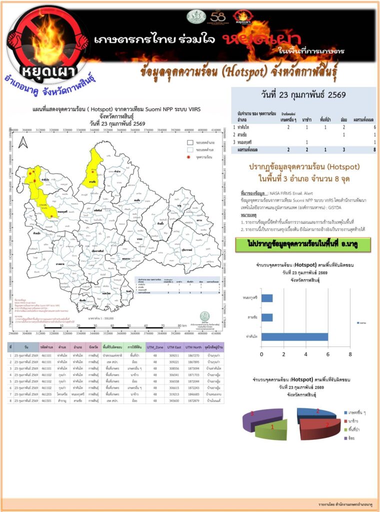 ข้อมูลจุดความร้อนจากดาวเทียม Suomi NPP ระบบ VIIRS จังหวัดกาฬสินธุ์ 20260223