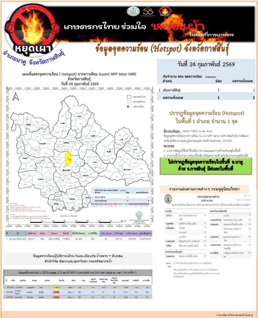 ข้อมูลจุดความร้อนจากดาวเทียม Suomi NPP ระบบ VIIRS จังหวัดกาฬสินธุ์ 20260224