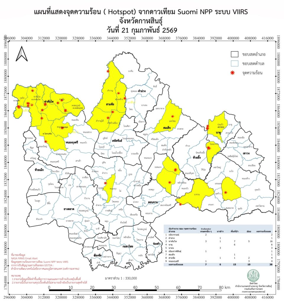 ข้อมูลจุดความร้อนจากดาวเทียม Suomi NPP ระบบ VIIRS จังหวัดกาฬสินธุ์ 20260221
