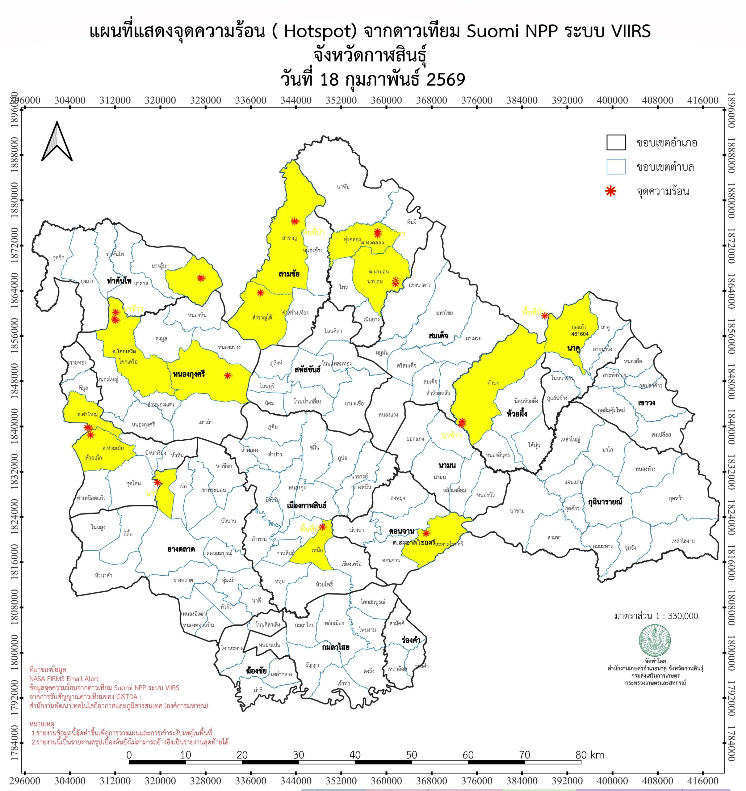 By nakhu / 21 กุมภาพันธ์ 2026 แผนที่แสดงจุดความร้อน ( Hotspot) จากดาวเทียม Suomi NPP ระบบ VIIRS จังหวัดกาฬสินธุ์ วันที่ 18 กุมภาพันธ์ 2569 4600_20260218ดาวน์โหลด N_Vi1_20260218_0111ดาวน์โหลด