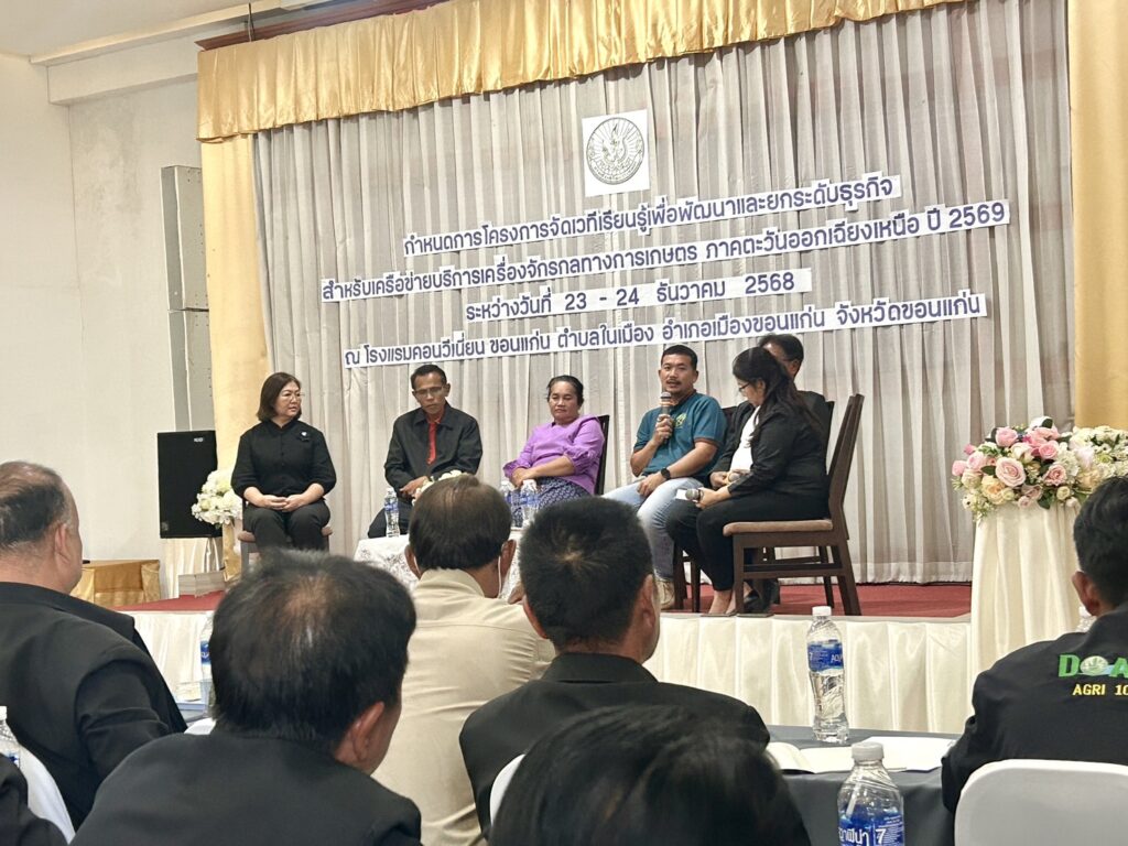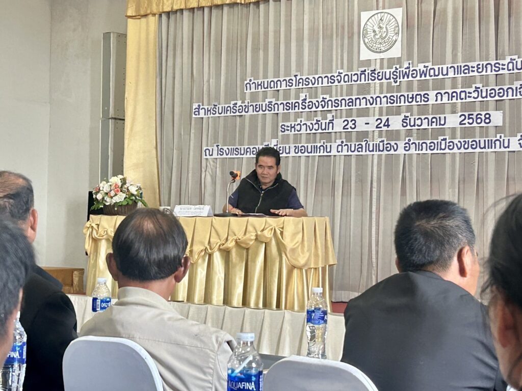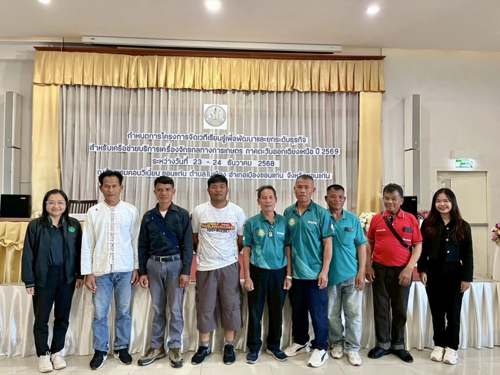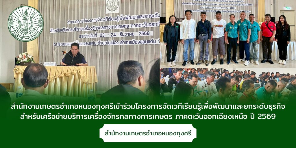 นางรวิสรา นรินญา เกษตรอำเภอหนองกุงศรี มอบหมายให้ นางสาวสินธรา เคนคำภา นักวิชาการส่งเสริมการเกษตรปฏิบัติการ พร้อมด้วยเกษตรกรจำนวน 8 ราย เข้าร่วมโครงการจัดเวทีเรียนรู้เพื่อพัฒนาและยกระดับธุรกิจ สำหรับเครือข่ายบริการเครื่องจักรกลทางการเกษตร ภาคตะวันออกเฉียงเหนือ ปี 2569 ระหว่างวันที่ 23-24 ธันวาคม 2568 โดยมี นายกมล โสพัฒน์ ผู้อำนวยการสำนักงานส่งเสริมและพัฒนาการเกษตรที่ 4 จังหวัดขอนแก่น เป็นประธานในพิธีเปิดการจัดเวทีฯ ณ โรงแรมคอนวีเนี่ยน ขอนแก่น ตำบลในเมือง อำเภอเมืองขอนแก่น จังหวัดขอนแก่น