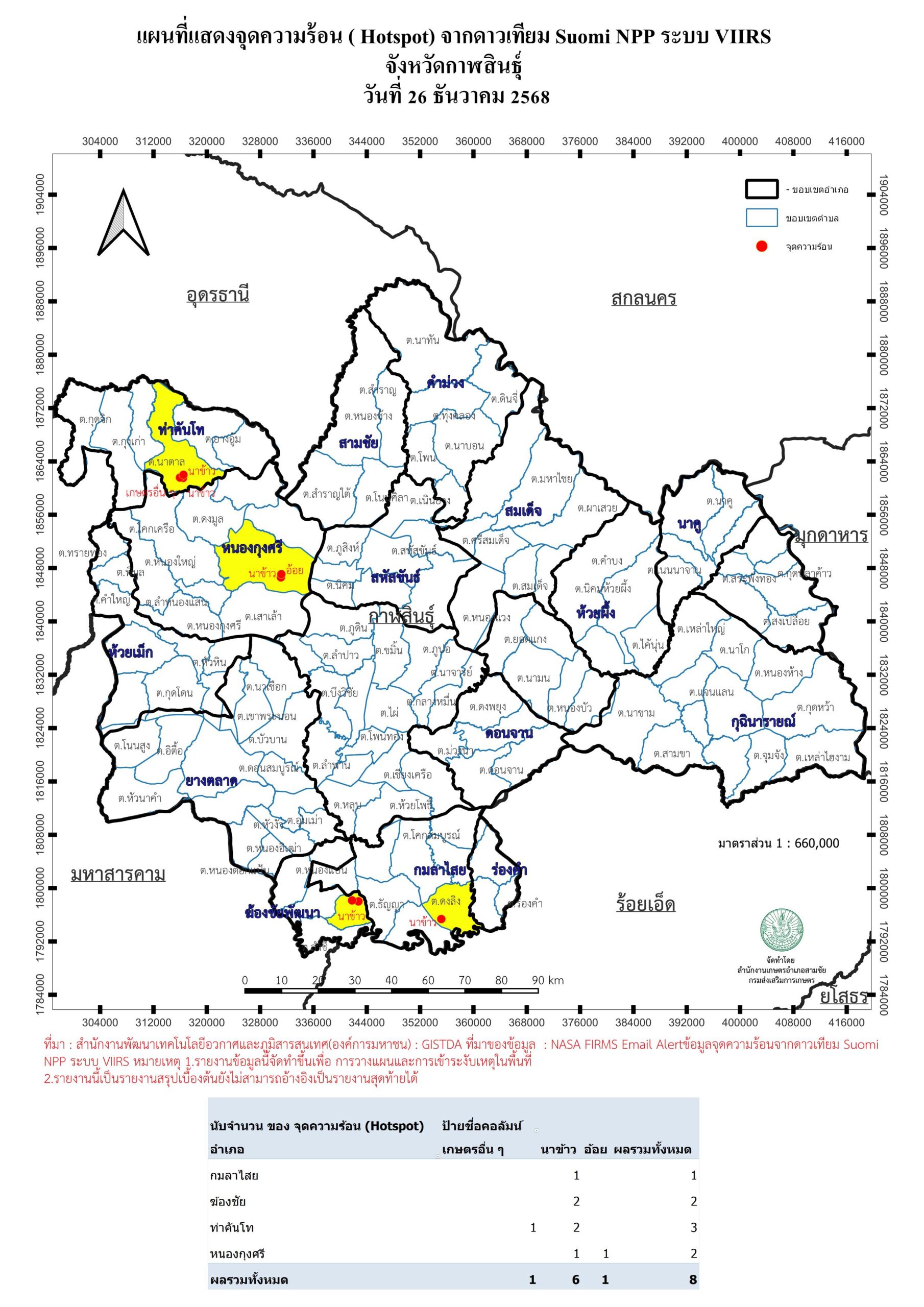 แผนที่แสดงจุดความร้อน ( Hotspot) จากดาวเทียม Suomi NPP ระบบ VIIRS 20251226 26 ธันวาคม 2025 ข้อมูลจุดความร้อน ( Hotspot) จากดาวเทียม Suomi NPP ระบบ VIIRS จังหวัดกาฬสินธุ์วันที่ 26 ธันวาคม 2568 4600_20251226ดาวน์โหลด G_Vi1_20251226_0117ดาวน์โหลด G_Vi1_20251226_1228ดาวน์โหลด