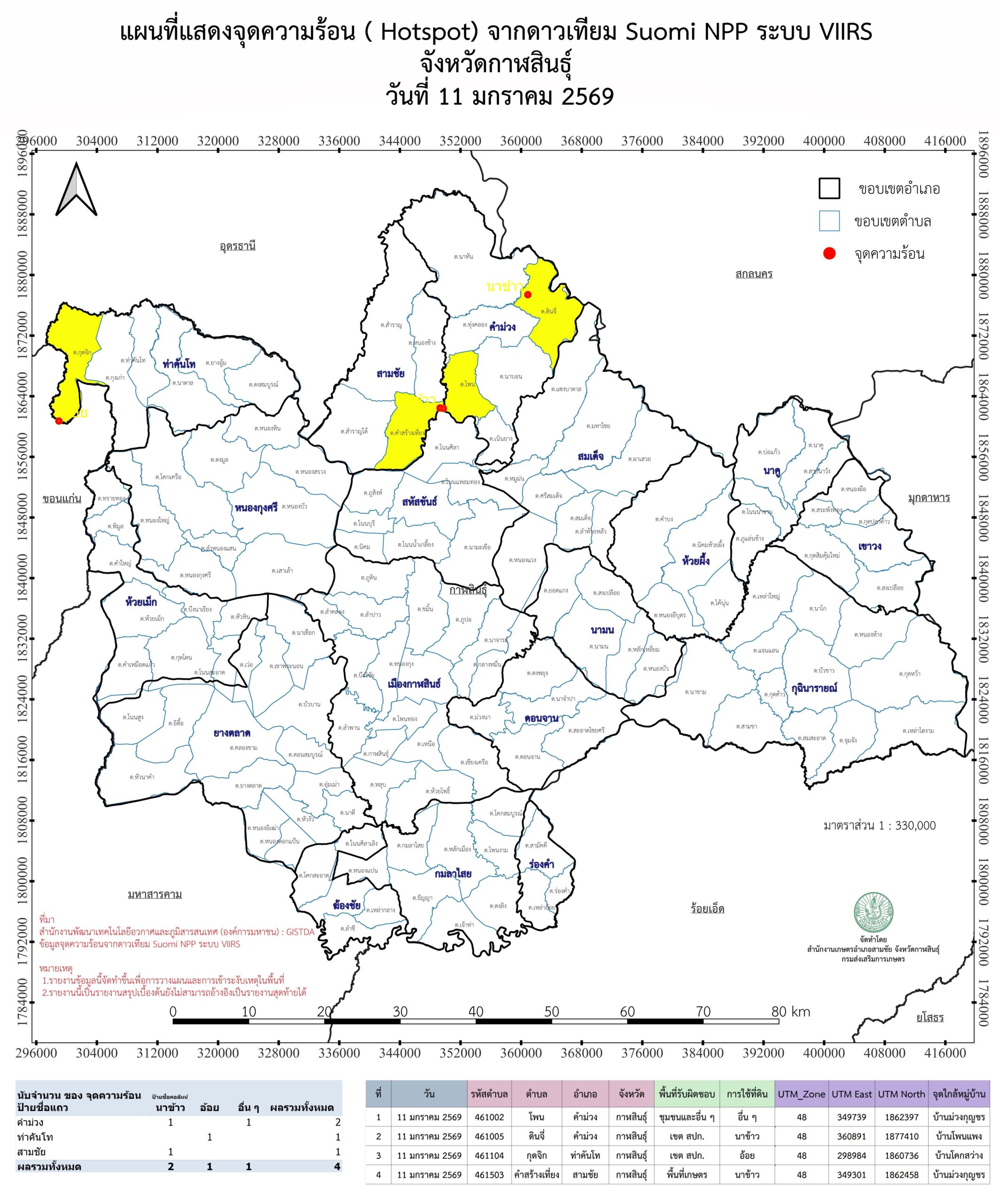 แผนที่แสดงจุดความร้อน ( Hotspot) จากดาวเทียม Suomi NPP ระบบ VIIRS 20260111 11 มกราคม 2026 ข้อมูลจุดความร้อน ( Hotspot) จากดาวเทียม Suomi NPP ระบบ VIIRS จังหวัดกาฬสินธุ์ วันที่ 11 มกราคม 2569 4600_20260110ดาวน์โหลด G_Vi1_20260111_0117ดาวน์โหลด