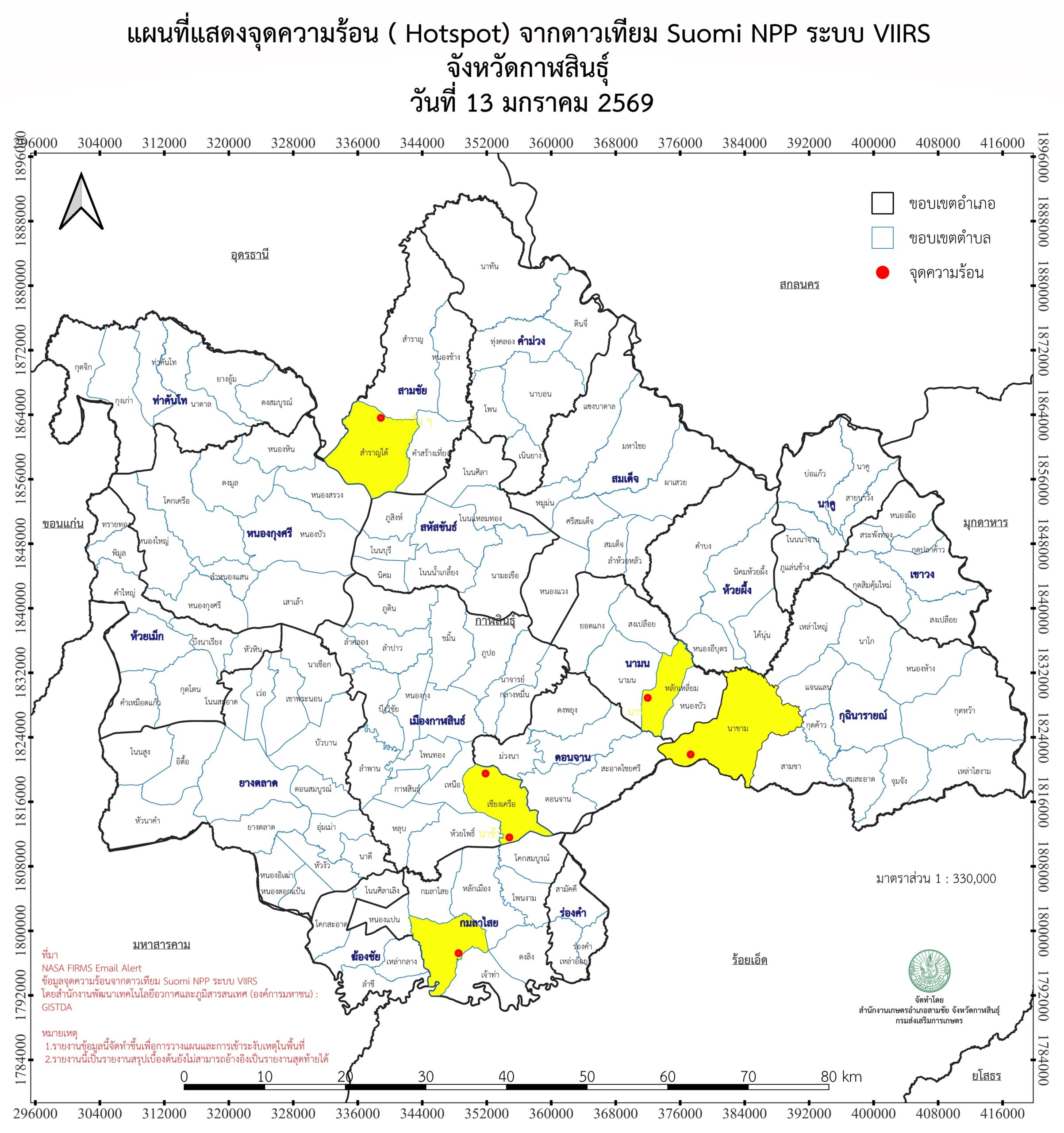 แผนที่แสดงจุดความร้อน ( Hotspot) จากดาวเทียม Suomi NPP ระบบ VIIRS 20260113 14 มกราคม 2026 ข้อมูลจุดความร้อน ( Hotspot) จากดาวเทียม Suomi NPP ระบบ VIIRS จังหวัดกาฬสินธุ์ วันที่ 13 มกราคม 2569 4600N_Vi1_20260113ดาวน์โหลด
