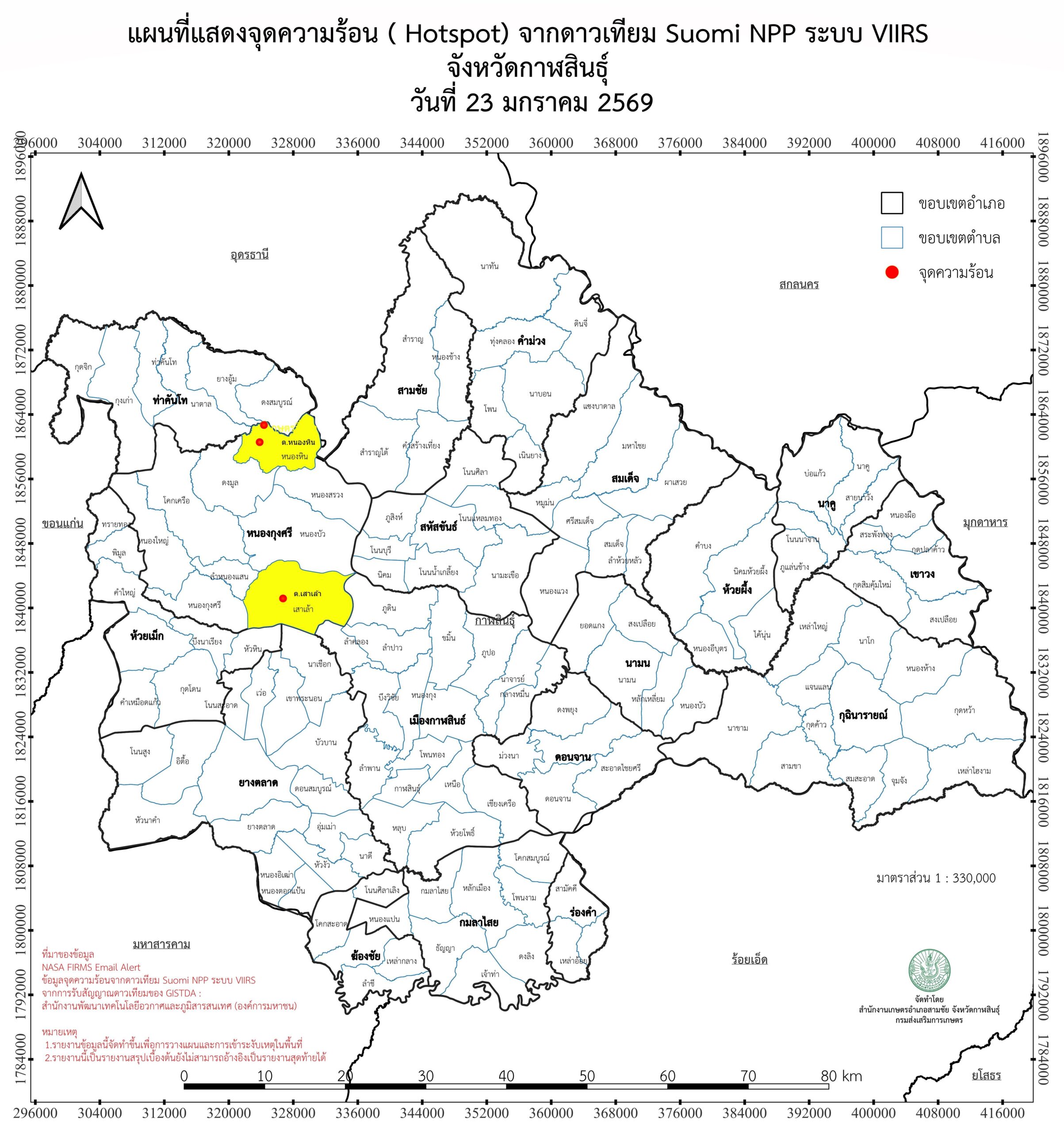 แผนที่แสดงจุดความร้อน ( Hotspot) จากดาวเทียม Suomi NPP ระบบ VIIRS 20260123 26 มกราคม 2026 ข้อมูลจุดความร้อน ( Hotspot) จากดาวเทียม Suomi NPP ระบบ VIIRS จังหวัดกาฬสินธุ์ วันที่ 23 มกราคม 2569 4600_20260123ดาวน์โหลด N_Vi1_20260123_0237ดาวน์โหลด