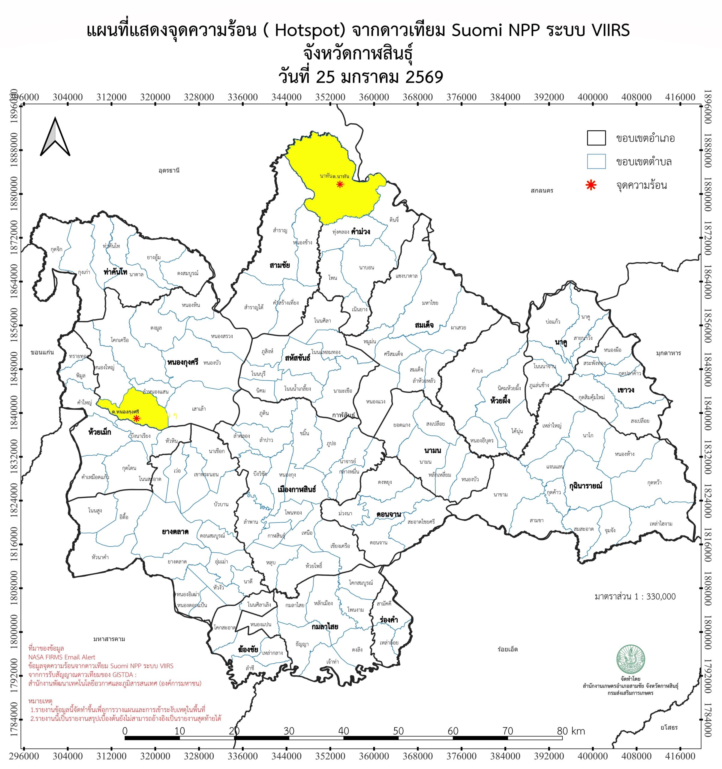 แผนที่แสดงจุดความร้อน ( Hotspot) จากดาวเทียม Suomi NPP ระบบ VIIRS 20260125 26 มกราคม 2026 ข้อมูลจุดความร้อน ( Hotspot) จากดาวเทียม Suomi NPP ระบบ VIIRS จังหวัดกาฬสินธุ์ วันที่ 25 มกราคม 2569 4600_20260125ดาวน์โหลด N_Vi1_20260125_0200ดาวน์โหลด