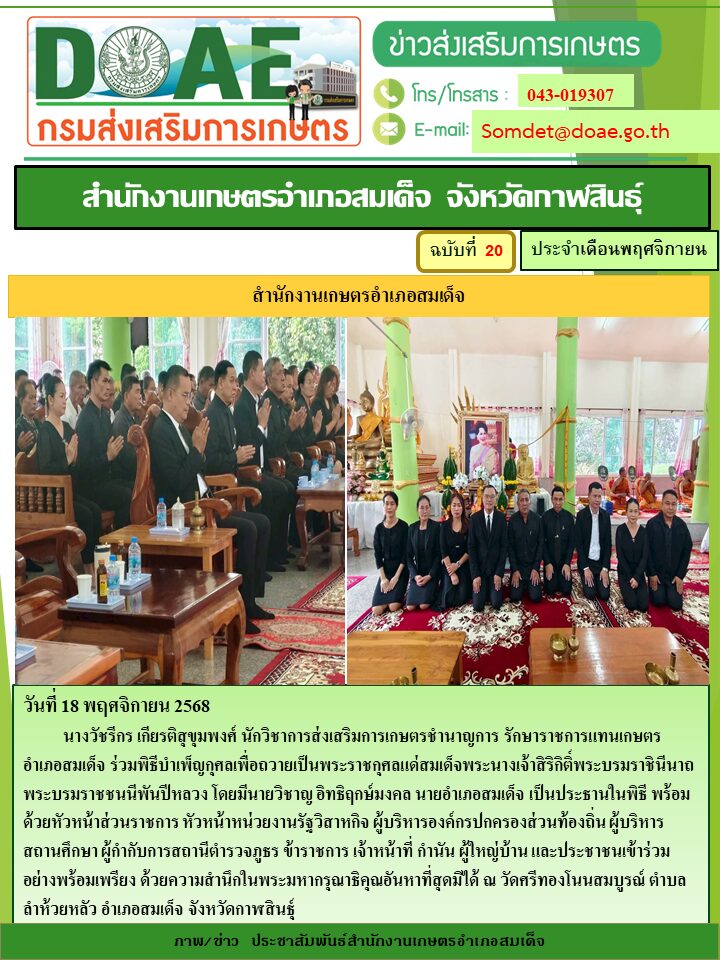 นางวัชรีกร เกียรติสุขุมพงศ์ นักวิชาการส่งเสริมการเกษตรชำนาญการ รักษาราชการแทนเกษตรอำเภอสมเด็จ ร่วมพิธีบำเพ็ญกุศลเพื่อถวายเป็นพระราชกุศลแด่สมเด็จพระนางเจ้าสิริกิติ์พระบรมราชินีนาถ พระบรมราชชนนีพันปีหลวง โดยมีนายวิชาญ อิทธิฤกษ์มงคล นายอำเภอสมเด็จ เป็นประธานในพิธี พร้อมด้วยหัวหน้าส่วนราชการ หัวหน้าหน่วยงานรัฐวิสาหกิจ ผู้บริหารองค์กรปกครองส่วนท้องถิ่น ผู้บริหารสถานศึกษา ผู้กำกับการสถานีตำรวจภูธร ข้าราชการ เจ้าหน้าที่ กำนัน ผู้ใหญ่บ้าน และประชาชนเข้าร่วมอย่างพร้อมเพรียง ด้วยความสำนึกในพระมหากรุณาธิคุณอันหาที่สุดมิได้ ณ วัดศรีทองโนนสมบูรณ์ ตำบลลำห้วยหลัว อำเภอสมเด็จ จังหวัดกาฬสินธุ์