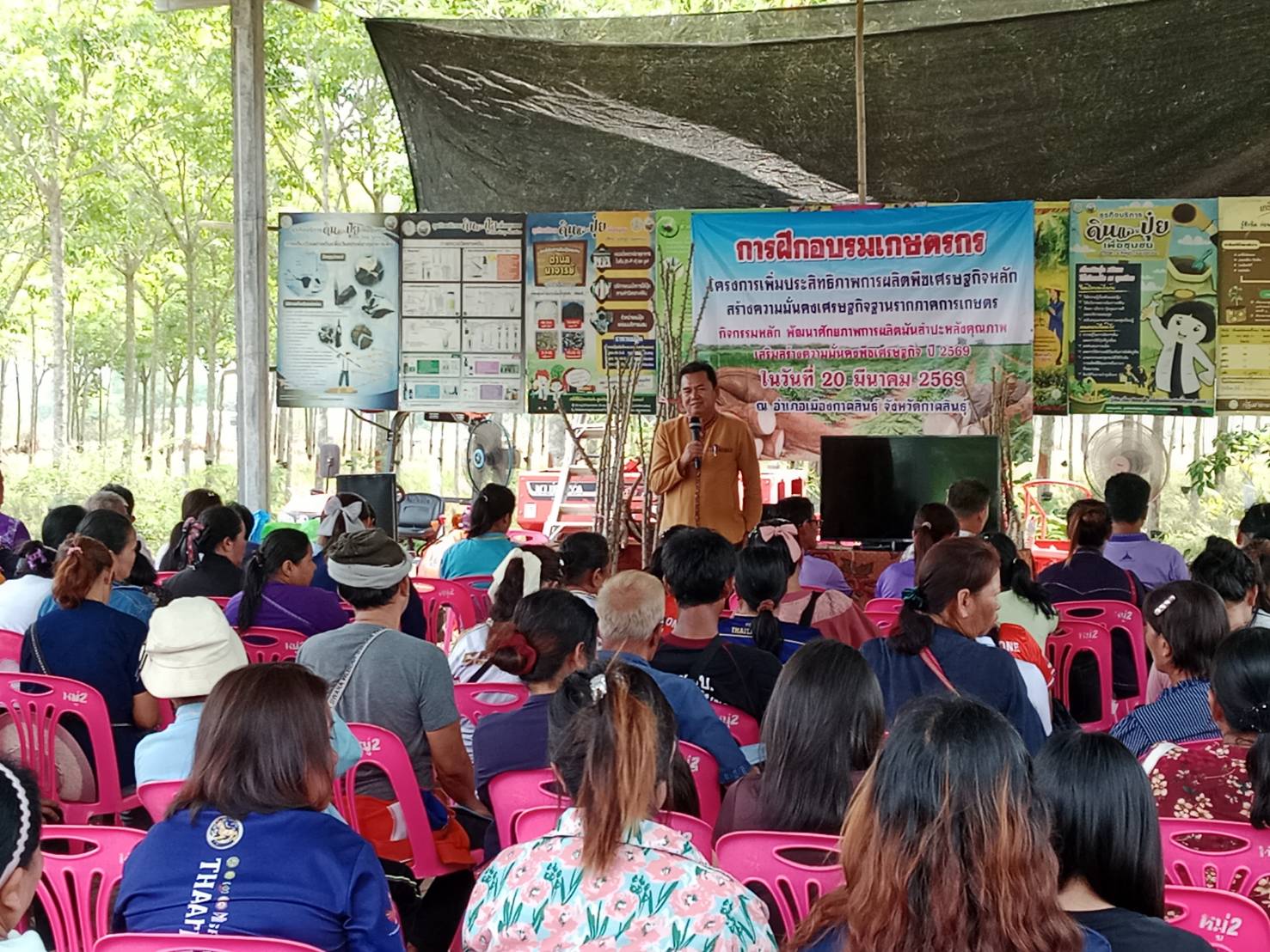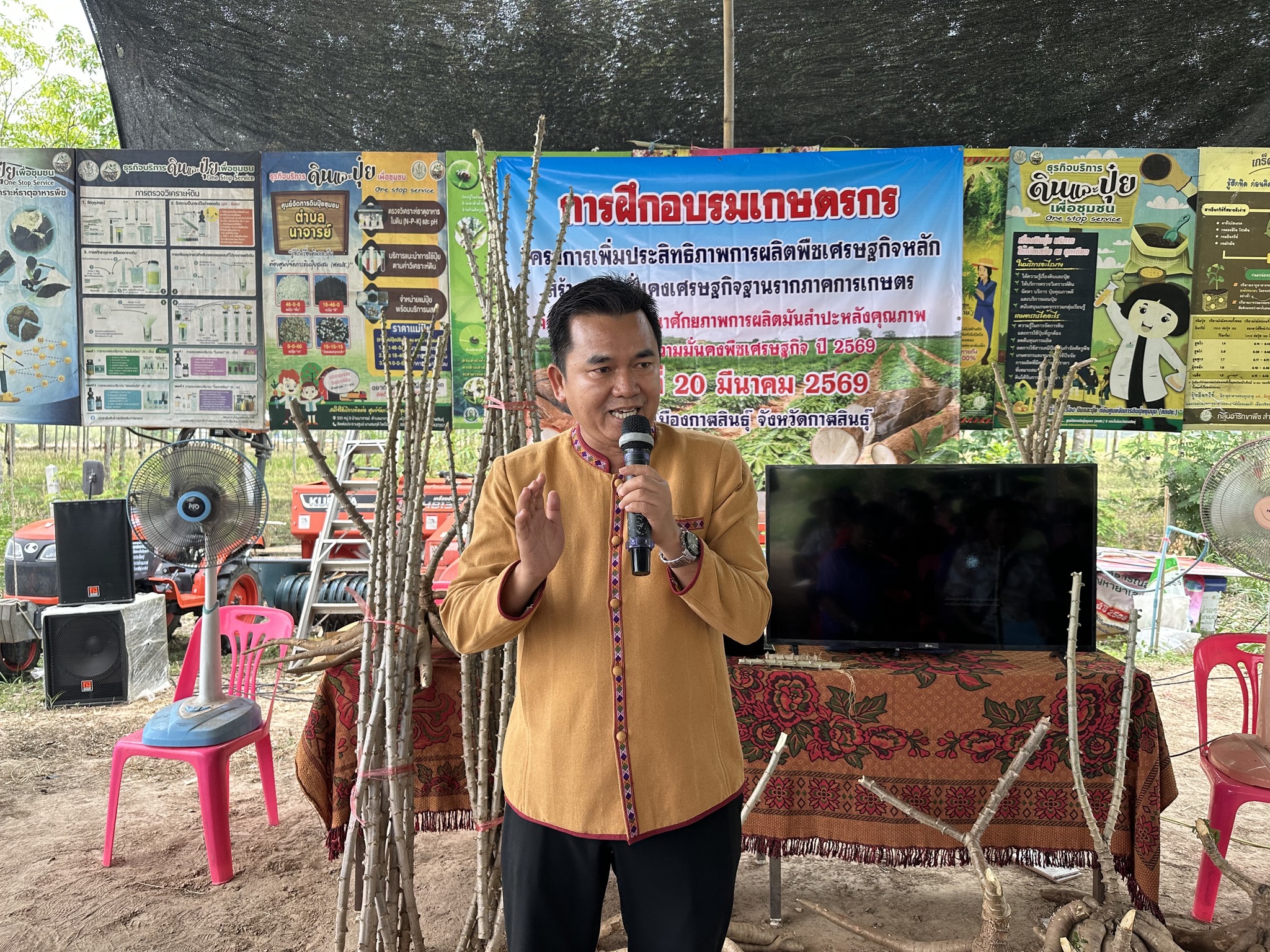 วันที่ 20 มีนาคม 2569 นายธานินทร์ ภูติโส เกษตรอำเภอท่าคันโท มอบหมาย นางสาวเพ็ญจันทร์ ภูทองพัน นักวิชาการส่งเสริมการเกษตรชำนาญการ พร้อมด้วยเกษตรกรในพื้นที่อำเภอท่าคันโท จำนวน 10 ราย เข้าร่วมอบรมเกษตรกร ในโครงการ “เพิ่มประสิทธิภาพการผลิตพืชเศรษฐกิจหลักสร้างความมั่นคงเศรษฐกิจฐานรากภาคการเกษตร” โดยมุ่งเน้นกิจกรรมหลักคือการพัฒนาศักยภาพการผลิตมันสำปะหลังคุณภาพ เพื่อเสริมสร้างความมั่นคงพืชเศรษฐกิจ ประจำปีงบประมาณ พ.ศ. 2569 โดยมี นายคมกริช ไตรยศ เกษตรจังหวัดกาฬสินธุ์ให้เกียรติเป็นประธานในการเปิดการอบรม ณ ศูนย์จัดการดินปุ๋ยชุมชน (ศดปช.) ตำบลนาจารย์ หมู่ที่ 9 อำเภอเมืองกาฬสินธุ์ จังหวัดกาฬสินธุ์